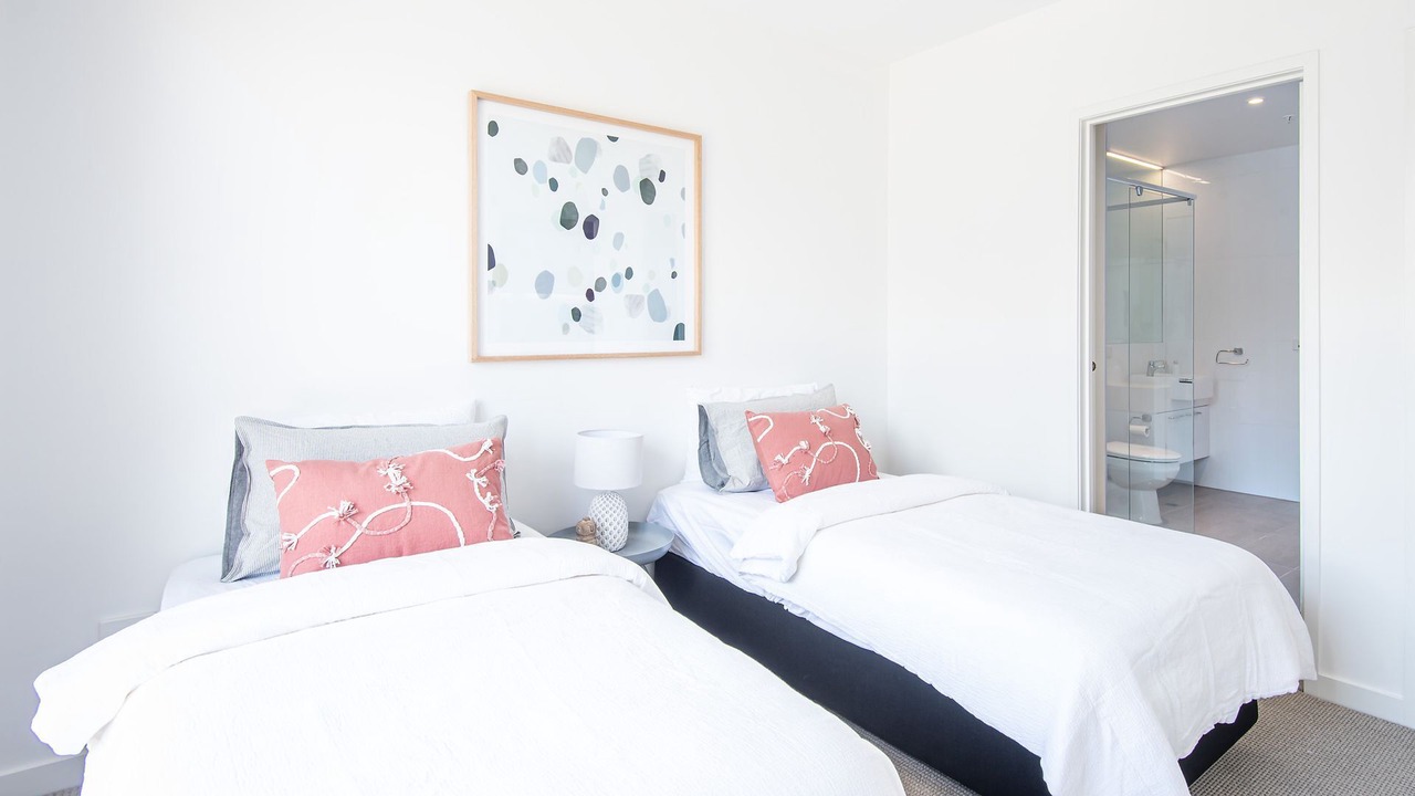 Bedroom Two. Two single beds with ensuite and TV, sliding door with balcony access