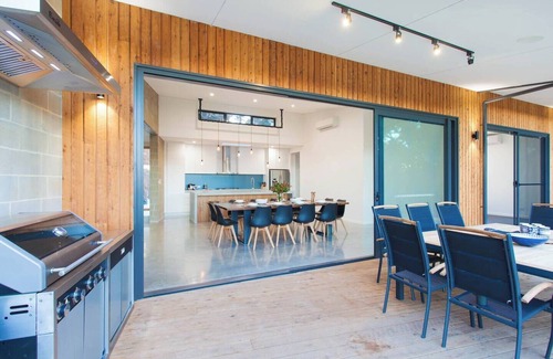 The home is designed with two separate sleeping wings including one king bedroom and three queen rooms all boasting their own ensuite, air conditioning, and sliding doors leading out to the deck. The fifth bedroom offers a bunk bed along with a single bed and is serviced by the main bathroom with a deep bath, walk-in shower and a separate toilet.